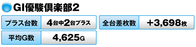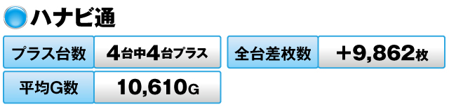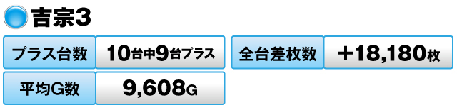 10台中9台がプラスで全台差枚数は+18,180枚を記録。平均G数も9,608Gと稼働も文句なし。
