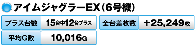 15台中12台がプラスで全台差枚数が+25,249枚、平均G数は実に10,016Gに達した。