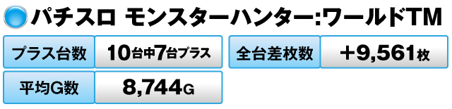 10台中7台がプラスで、全台差枚数は+9,561枚、平均G数は8,744Gだった。