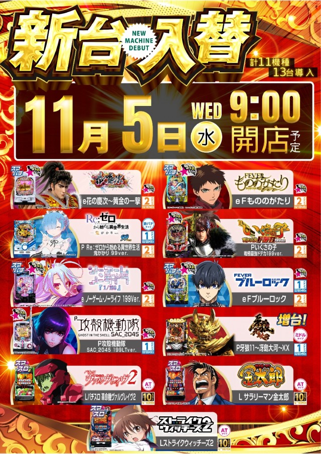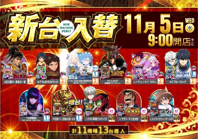 明日22日(水)パチンコ2機種・スロット2機種導入予定