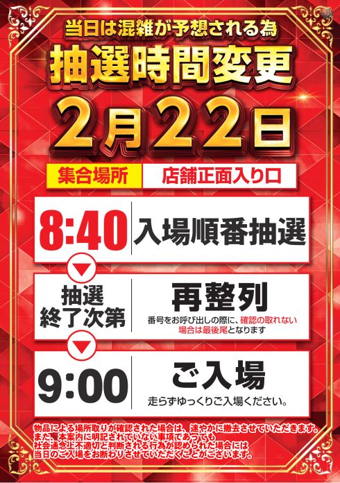 明日2月22日は抽選時間に変更があります!!