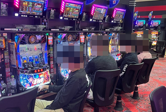 店内には多くのプレイヤーが集まっており、パチンコとパチスロの両方がにぎやか。