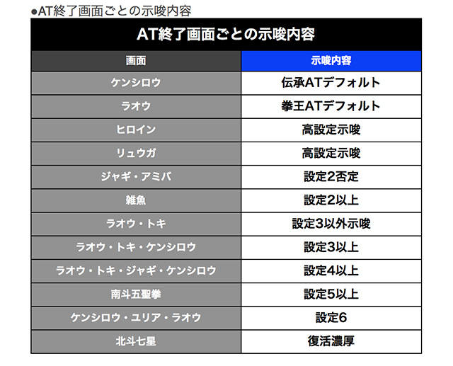 AT終了画面も注目で、ケンシロウ・ユリア・ラオウならば設定6が濃厚となる。