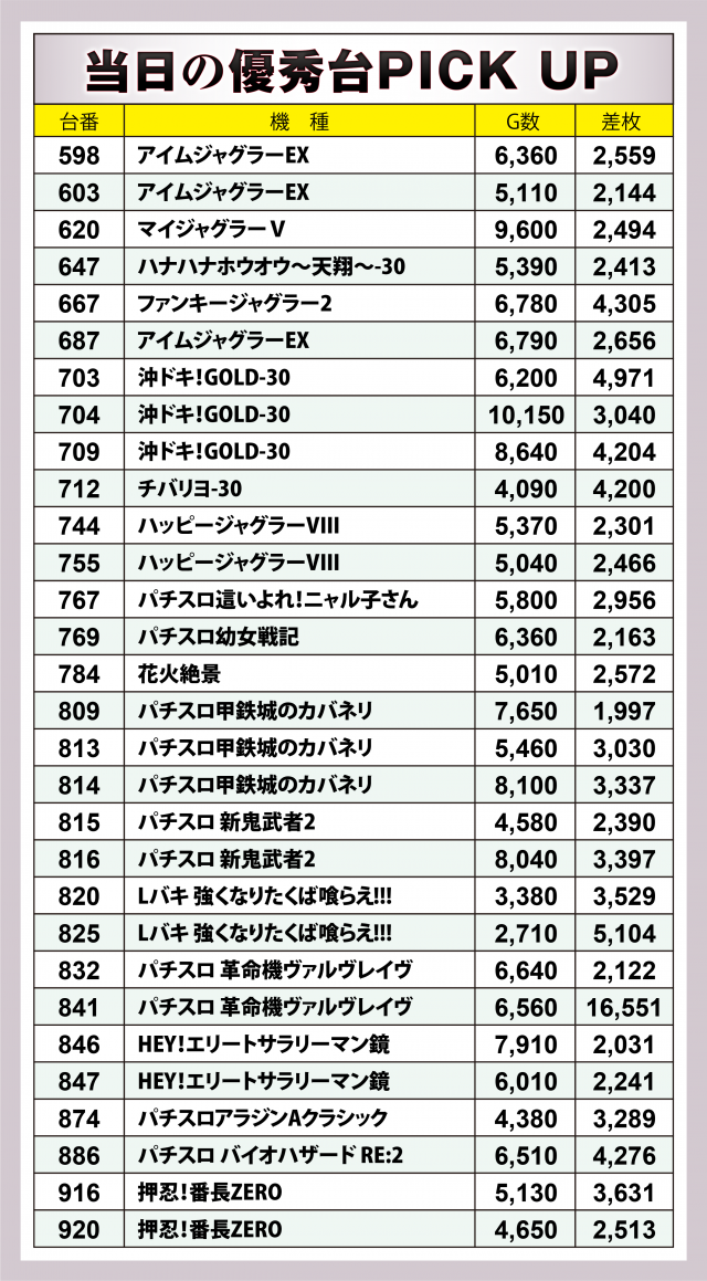 まずは優秀30台のPICK UPから。30台中29台と、ほとんどが差枚数+2千枚以上を達成、+3千枚以上は14台、+4千枚オーバーは6台となった。後述する横並び好況スポット以外では、なんといっても『パチスロ 革命機ヴァルヴレイヴ』が大記録、+1万6千枚オーバーをゲット! その他では、+5千枚台を筆頭に2台合計で+9千枚に迫った『Lバキ 強くなりたくば喰らえ!!!』、いずれも+4千枚を突破した『ファンキージャグラー2』『チバリヨ-30』『パチスロ バイオハザード RE:2』のハイスコアが光った。