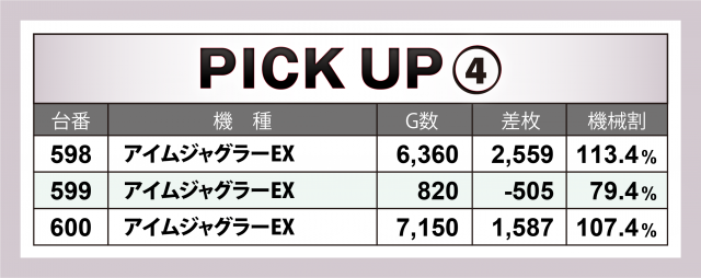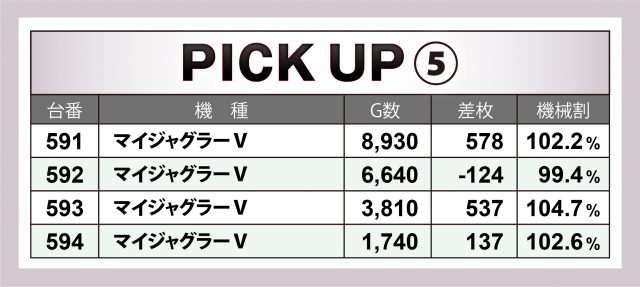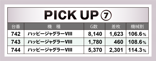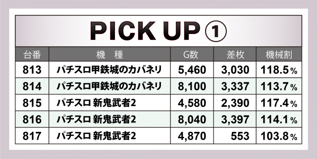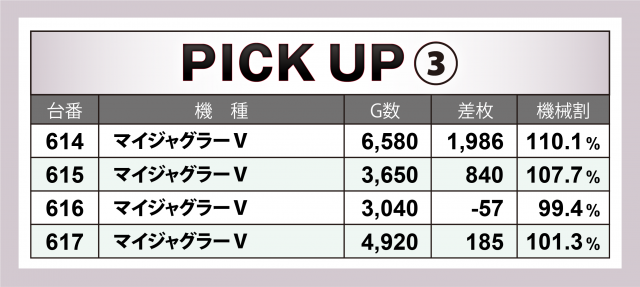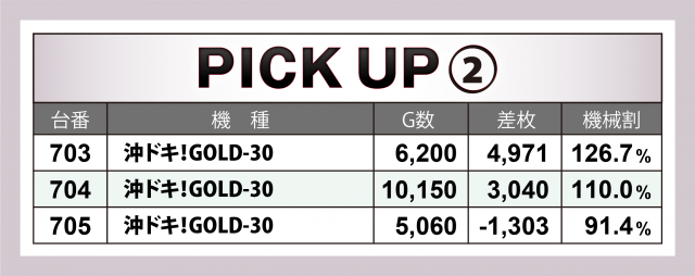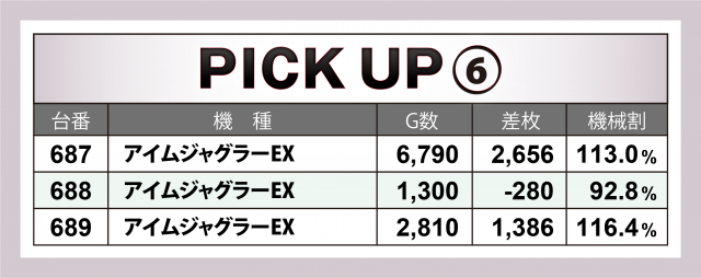 続いては6機種25台7箇所の横並び好況スポットをチェック。まず注目は『沖ドキ!GOLD-30』。3台中マイナスが1台あったが、+5千枚弱×1・+3千枚超×1という結果に。また、横並び以外にも+4千枚オーバー台を輩出。さらに、この日はジャグラーシリーズ3機種に好調台が目立ち、『マイジャグラーⅤ』『アイムジャグラーEX』『ハッピージャグラーVIII』それぞれに+2千枚突破台が複数。その他、+3千枚突破が2台となった『パチスロ甲鉄城のカバネリ』、2台で+6千枚目前となった『パチスロ 新鬼武者2』が好成績を収めた。