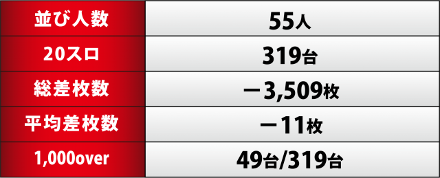 今回、[1000円/46枚] スロ319台のトータル差枚数は惜しくもプラスに届かず、またもや連勝を逃してしまった。一方で1,000overが前回より3台増えたことは喜ばしいことだが、全体の5分の1を超えていないことは少し残念。まずはトータルプラスを2回連続で成し遂げること、これが当面の最重要ミッションだろう。
