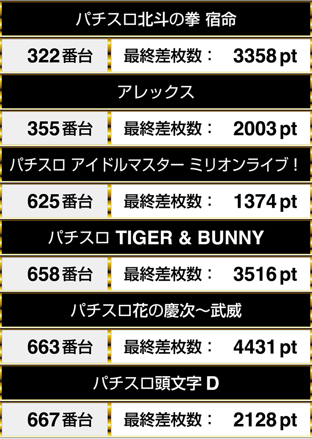 663番台の『パチスロ花の慶次~武威』が4431pt、658番台の『パチスロ TIGER & BUNNY』は3516pt!