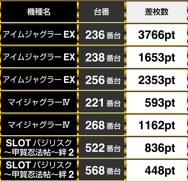 『SLOTバジリスク~甲賀忍法帖~絆2』も2台がプラスptとなった。