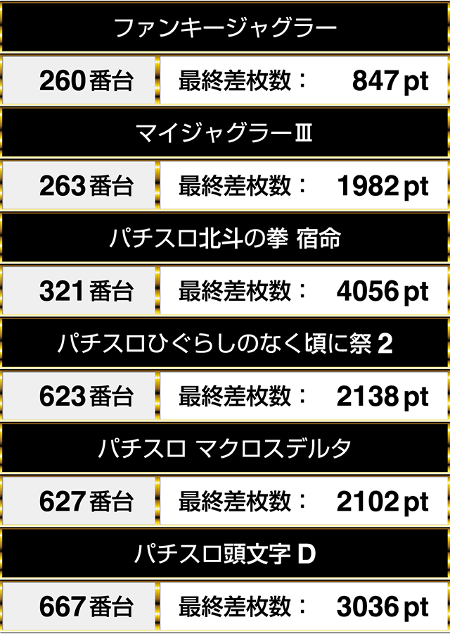 閉店時には2台がプラスptを記録し、1台は1162pt!!