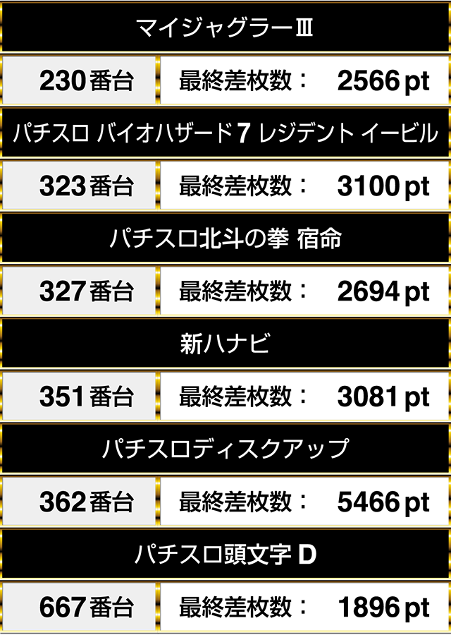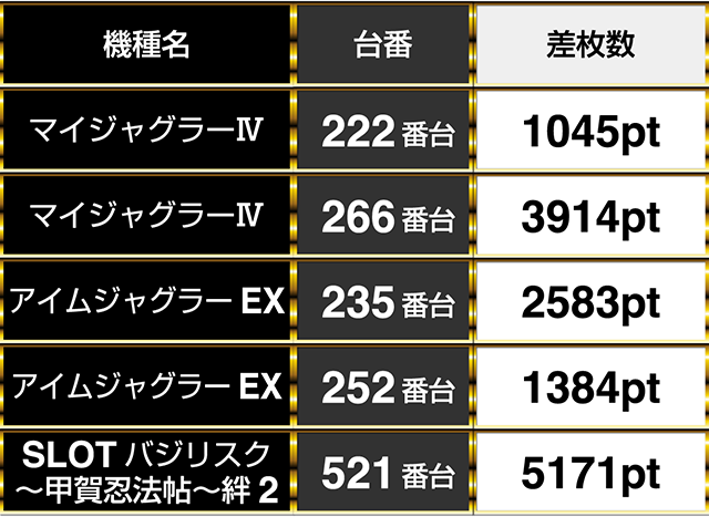 『アイムジャグラーEX』も2台が1000ptを上回り、そのうちの1台は2000pt以上であった。