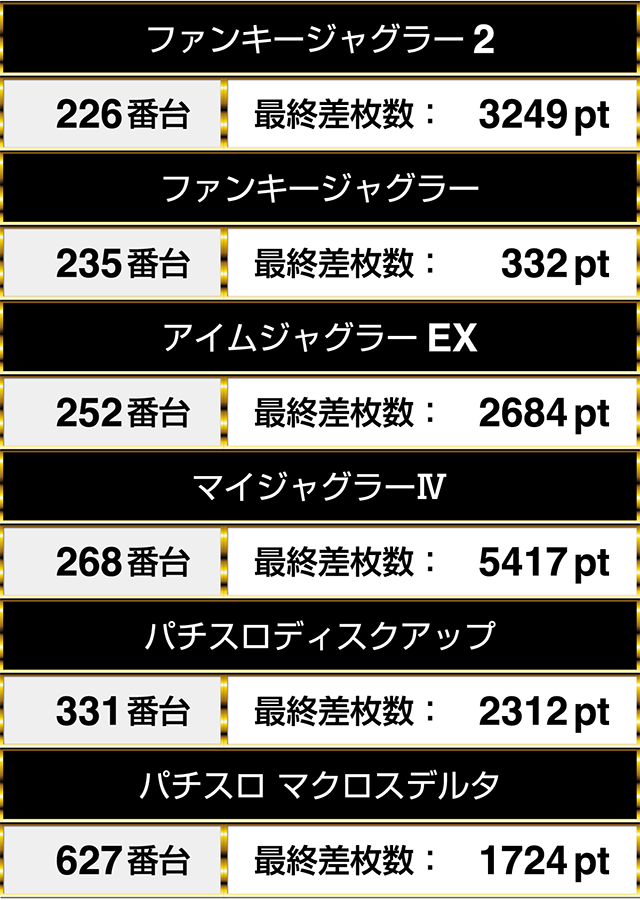 『ファンキージャグラー2』の226番台が3249pt、『アイムジャグラーEX』の252番台は2684pt!!