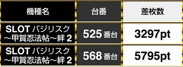 『パチスロ TIGER & BUNNY』の572番台と『パチスロ うしおととら 雷槍一閃』の660番台もプラスptとなった。