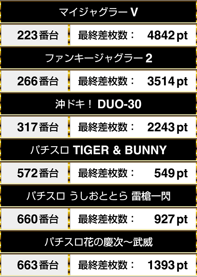 『マイジャグラーV』の223番台が4842pt、『ファンキージャグラー2』の266番台は3514pt!