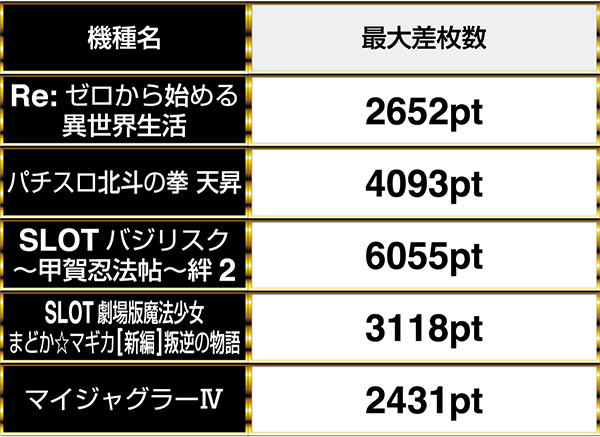 『パチスロ北斗の拳 天昇』と『SLOT劇場版魔法少女まどか☆マギカ[新編]叛逆の物語』の最大差枚数も3000pt以上!