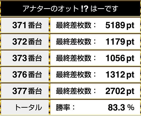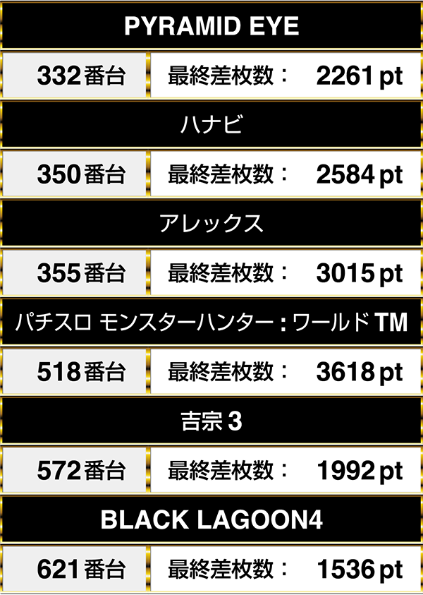 332番台の『PYRAMID EYE』と『ハナビ』の350番台は、2000ptを上回ってこの日を終えていた。