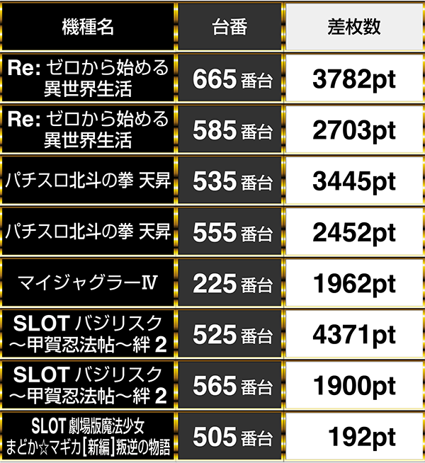 5日のデータをみると、『Re:ゼロから始める異世界生活』665番台と『パチスロ北斗の拳 天昇』535番台が3000ptオーバー!