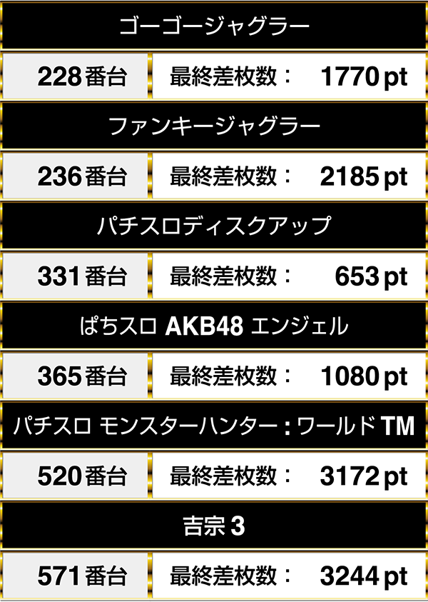 『吉宗3』の571番台が3244pt、『ファンキージャグラー』の236番台は2185ptを記録!