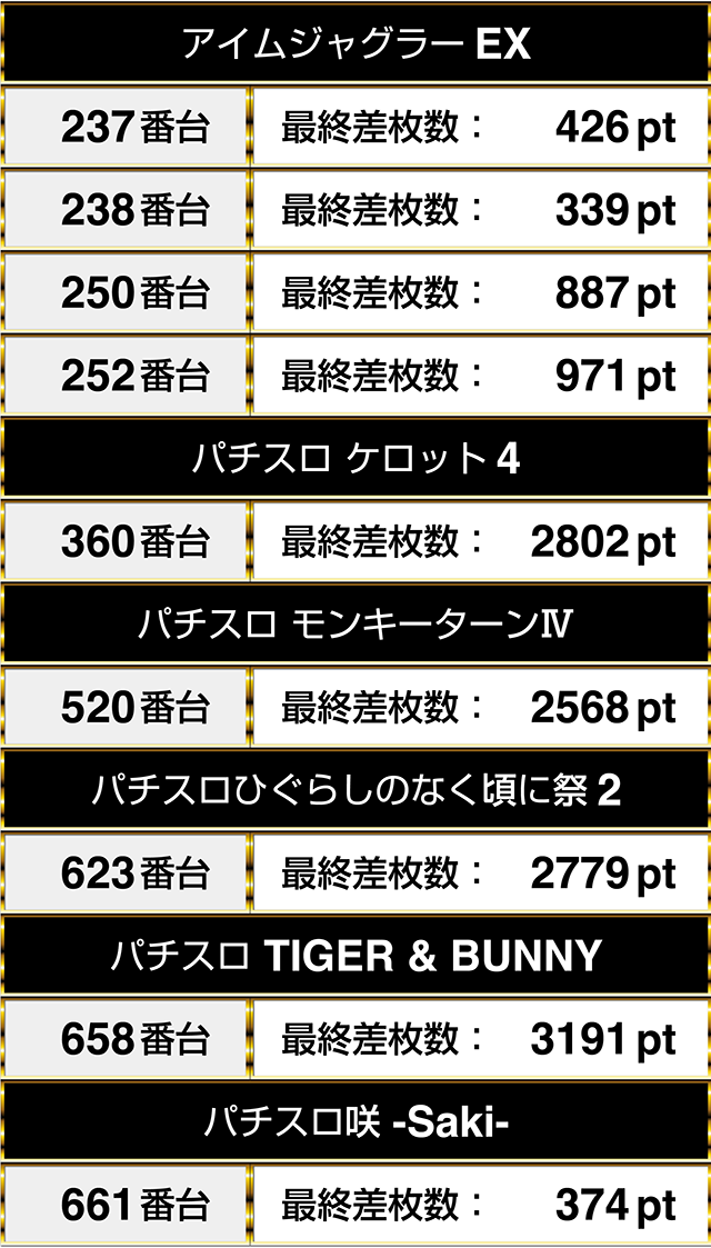 『マイジャグラーⅣ』は3台が1000pt以上であり、そのうちの2台が4000ptを上回った。