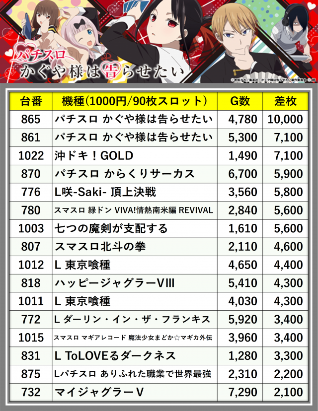 厳選された取材対象機種をはじめ、その他スロット全体から好記録が飛び出した!プレイヤーが楽しんだ1日を下記データにて振り返ってみて欲しい。
