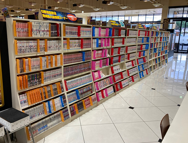 レストスペースにある本棚には、マンガ本がたくさん並んでいる。種類も多く、幅広い人の好みを満たしているラインナップとなっていた。