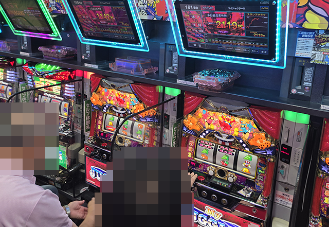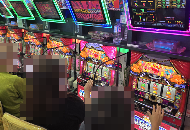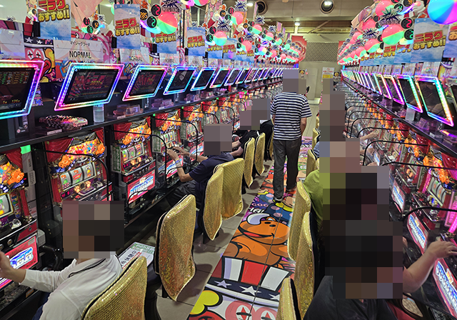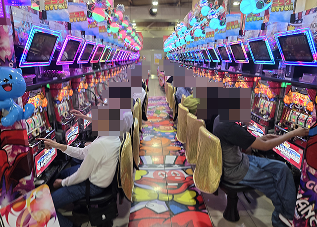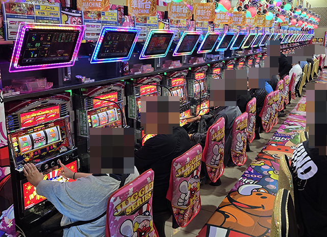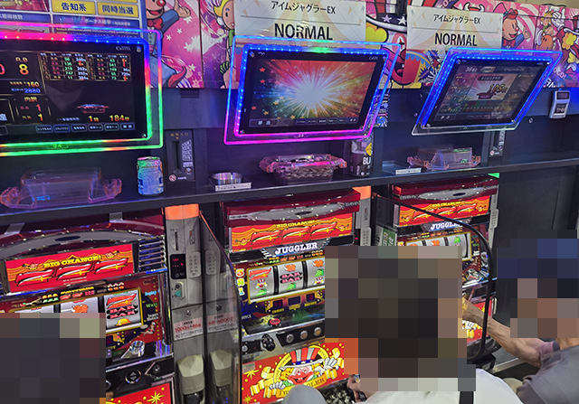 ジャグラーシリーズなどが人気を集めており、いくつもの台が輝きを放っていた。