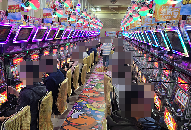 たくさんのプレイヤーが遊技を楽しみ、明るい雰囲気となっていた「ネオアイムジャグラーEX」。