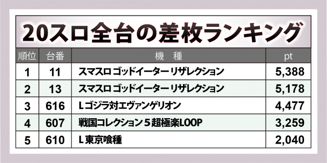 成績順で述べていくと、 『スマスロ ゴッドイーター リザレクション』には+5,400枚弱・+5,200枚弱が1台ずつ、『L ゴジラ対エヴァンゲリオン』の+4,500枚弱、『戦国コレクション5超極楽LOOP』の+3,300枚弱、『L 東京喰種』の+2,000枚超と、現在主流のスマスロが名を連ねた。