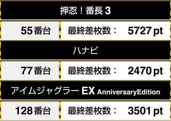 ボーナスタイプの機種にもプラスptは多く、『ハナビ』と『アイムジャグラーEX AnniversaryEdition』には2000pt以上を記録する台があった。