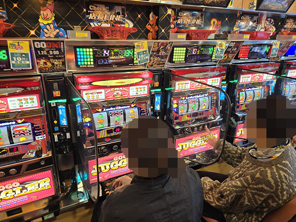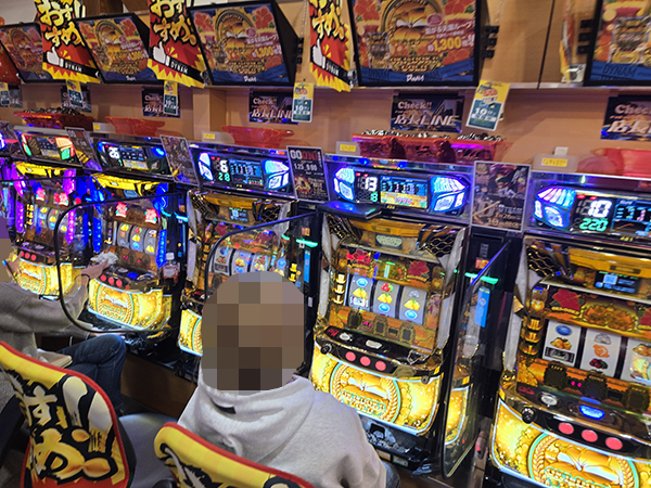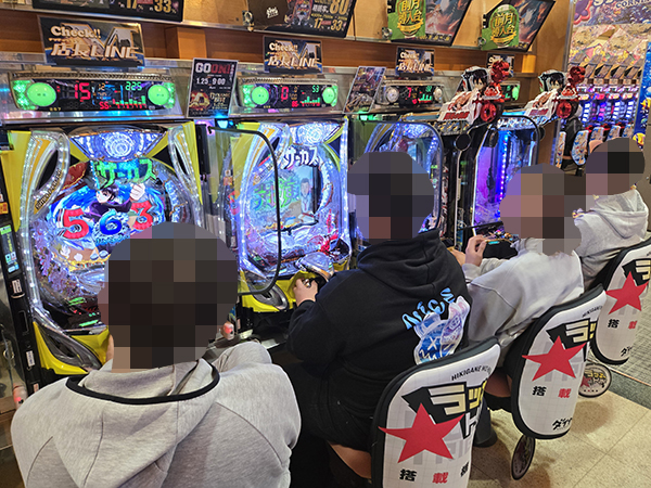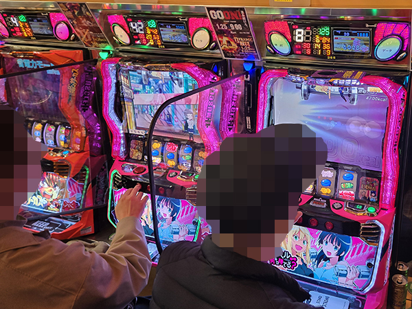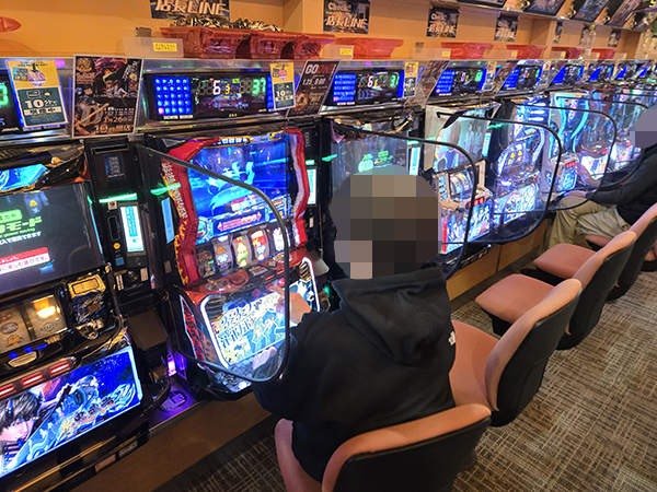取材時は多くのプレイヤーが来店。パチンコ・パチスロともに、様々な機種が支持を得ていた。