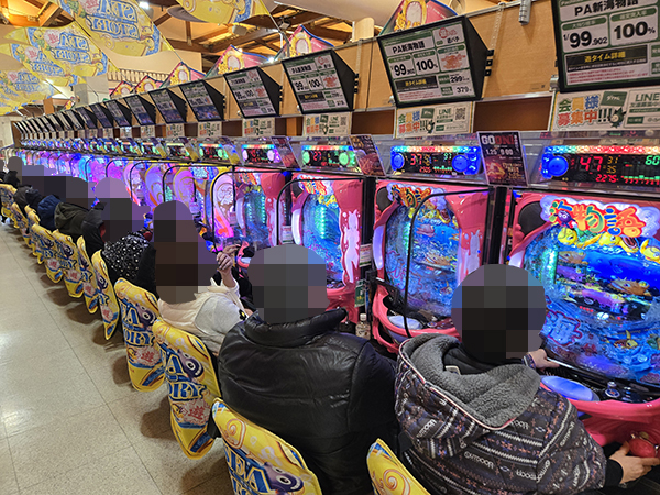 100円/90玉パチンコに目を移すと、「PA新海物語」といった海物語シリーズに人気が集まっており、ほぼ満席となるほどのにぎわいを見せていた。