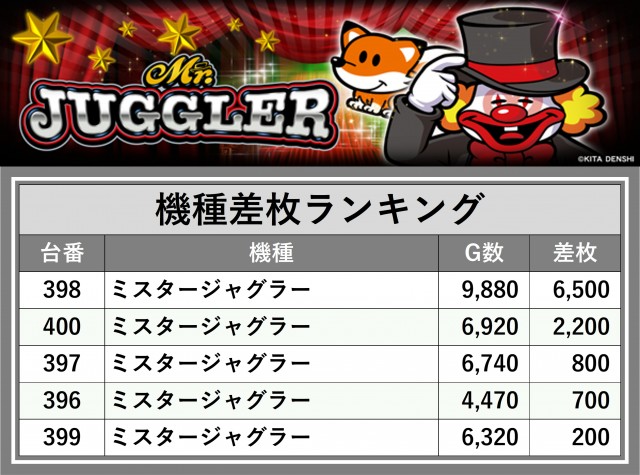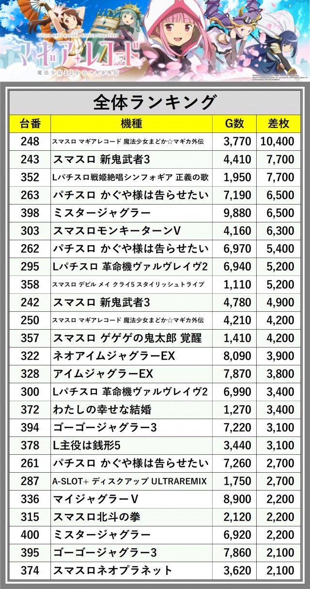 厳選された取材対象機種をはじめ、その他スロット全体から好記録が飛び出した!プレイヤーが楽しんだ1日を下記データにて振り返ってみて欲しい。