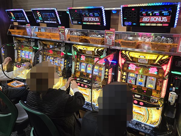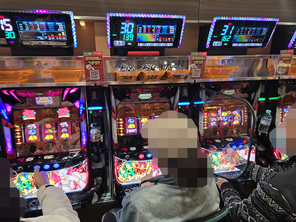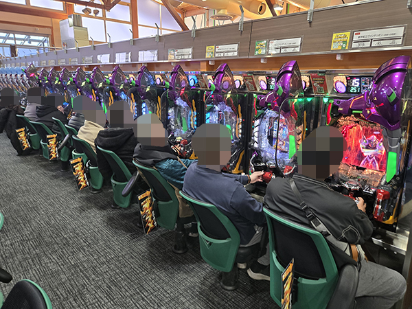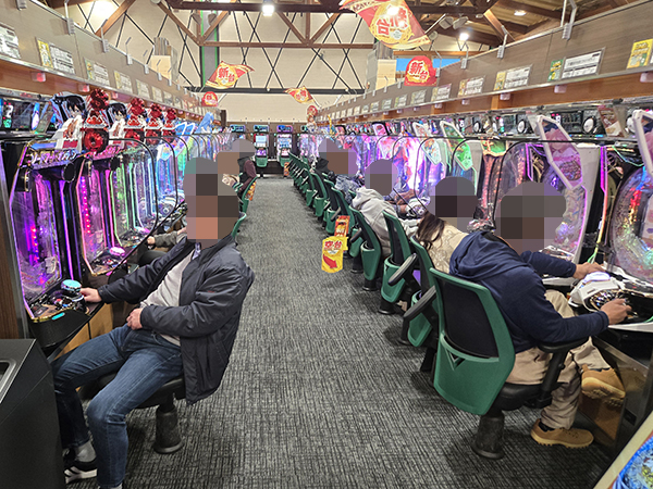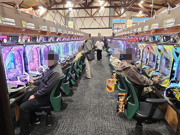 取材時は既に多くのプレイヤーが集結し、パチンコ・パチスロを問わずにぎやかな状況となっていた。
