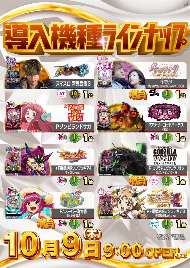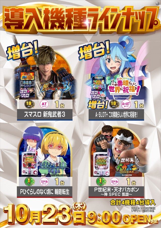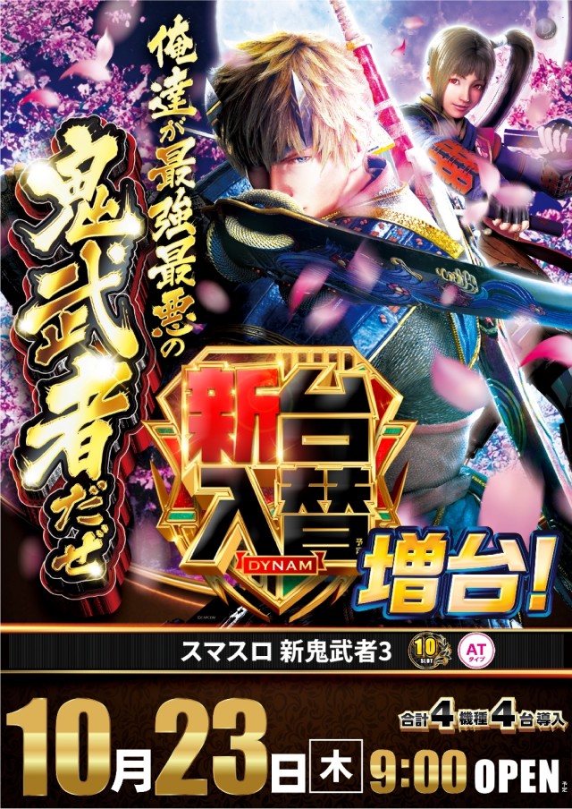 本日23日(木)スマスロ 新鬼武者3増台 など全4機種導入