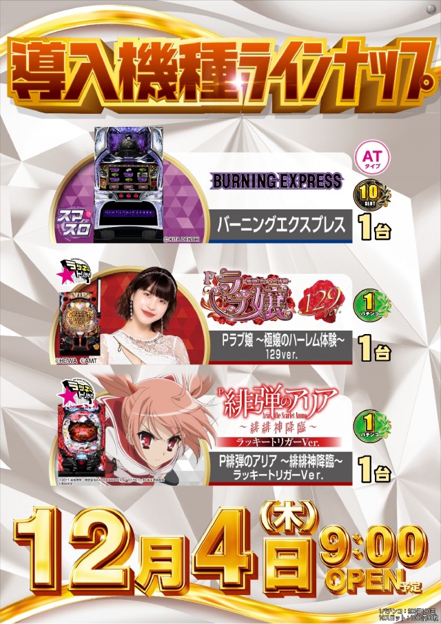 明日4日(木)バーニングエクスプレスなど全3機種導入