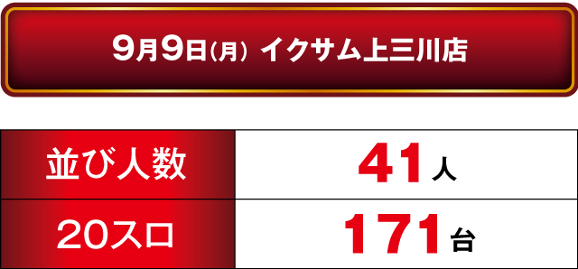 また、『スマスロ北斗の拳』と『パチスロL黄門ちゃま天』は+6,000枚超を達成、その他、様々な機種から+3,000枚超が多数発生し、店内は常に活気に満ち溢れた一日となった。