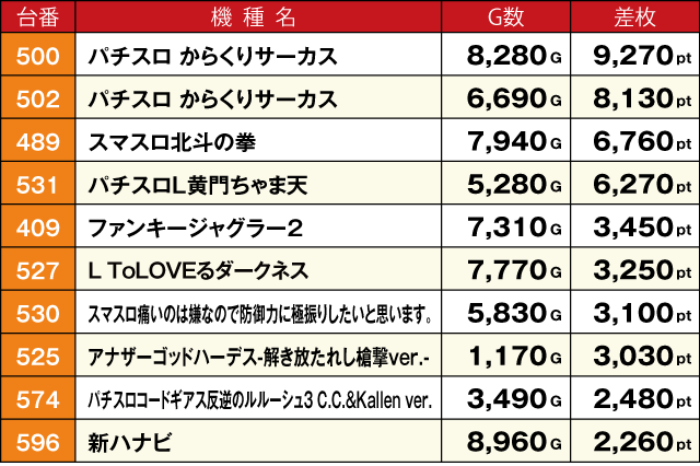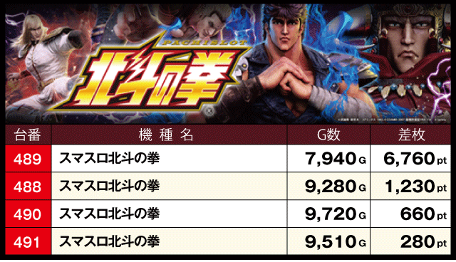 次に、優秀機種別データをチェックしてみると、全部で4台設置されている『スマスロ北斗の拳』が全台プラス、なかでも489番台は+6,760枚を記録する見事な結果を残している。