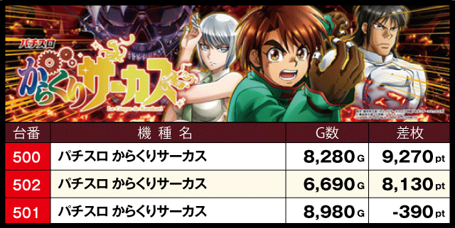 この日、最も盛り上がりを見せていたのが『パチスロ からくりサーカス』で、万枚目前の+9,270枚、+8,130枚を叩き出しトータルランキングでワンツーフィニッシュを決めていた。