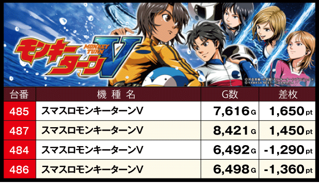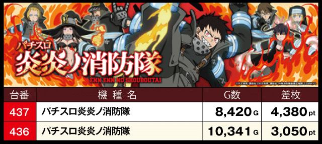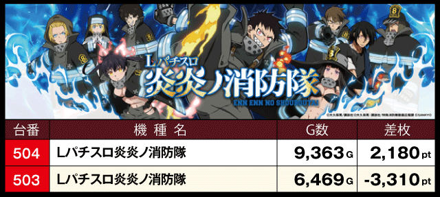 次に、優秀機種別データをチェックしてみると、2台設置の『パチスロ炎炎ノ消防隊』が+4,380枚、+3,050枚と共に好成績を記録、『Lパチスロ炎炎ノ消防隊』と『スマスロモンキーターンV』も半数の台がプラスで終了しているだけに、ファンにとっては充実した一日となったはずだ。