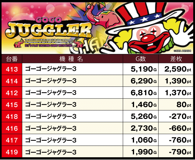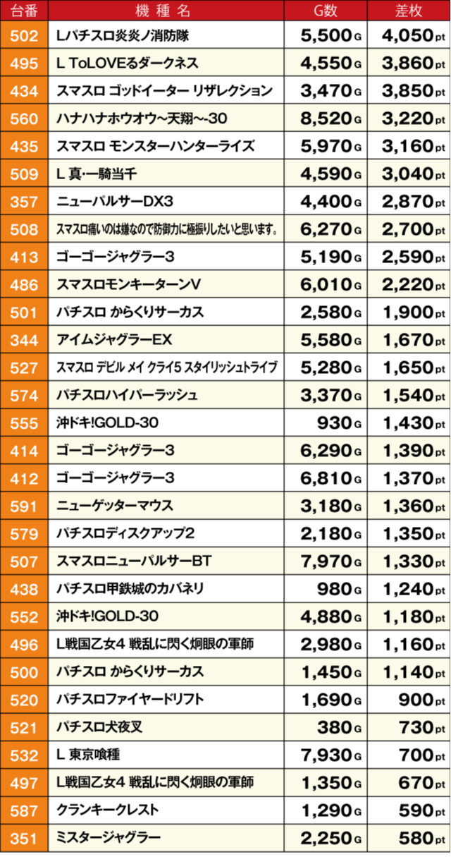 次に、優秀機種の状況をチェックしていこう。『スマスロ モンスターハンターライズ』の+3,160枚や『ゴーゴージャグラー3』の+2,590枚をはじめ、プラス差枚で実戦を終えている台が複数確認されており、それぞれのシマは常に活気とファンの笑顔で溢れる一日となっていた。