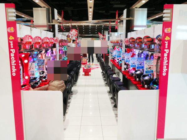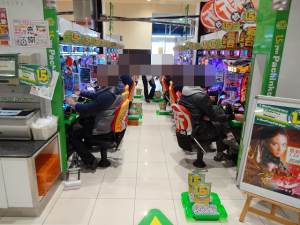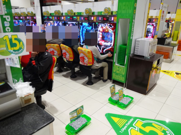 店内に入って見ると、ライトグリーン色が目印の1,54円パチンココーナーが盛り上がっていた。新台や甘デジなど、椅子カバーで分かるようになっており、お店側のプレイヤーへの優しさが伝わってくる。