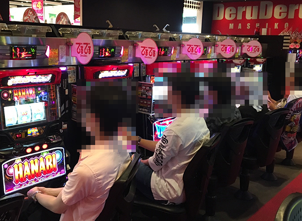 ジャグラーシリーズや「ハナビ」、「バーサス」などのボーナスタイプも好評。華やかなムードに包まれており、明るい表情をつくっているプレイヤーの姿も確認できた。