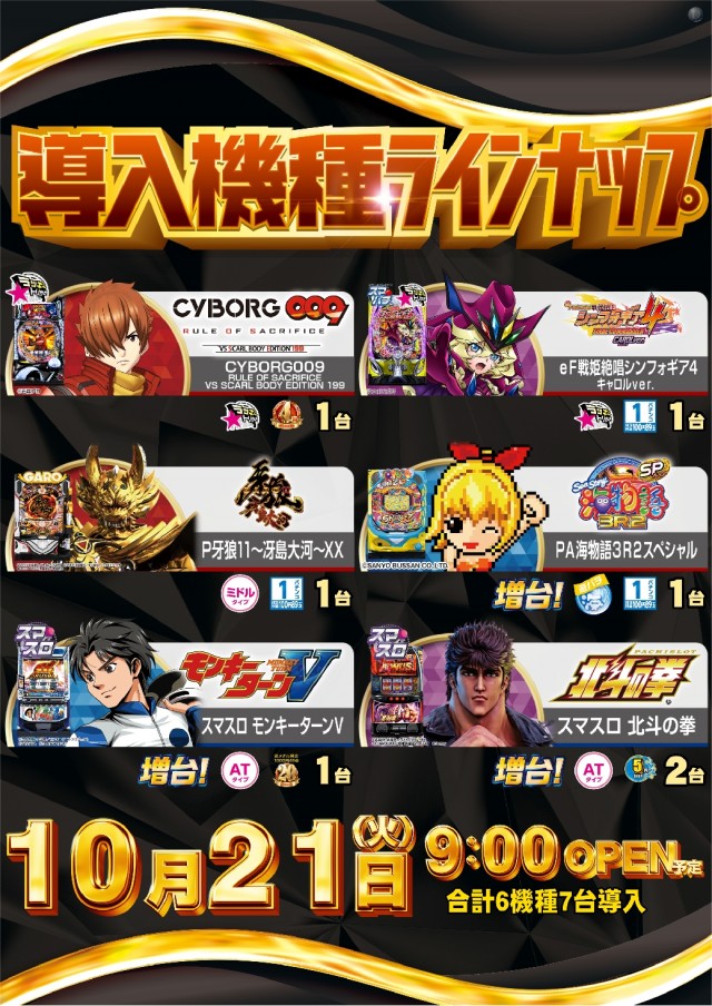本日21日(火)パチンコ4機種・スロット2機種導入予定