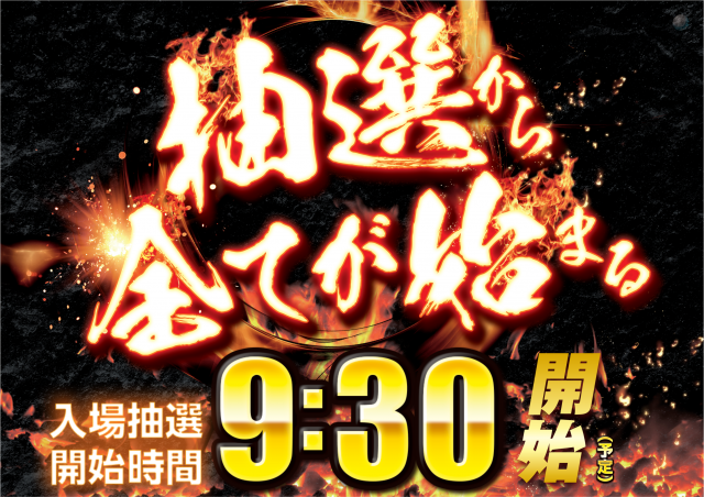 08:45 正面入口にて抽選開始 09:00 入場開始 抽選時間が変更になる場合がございます。詳しくは店舗配信のLINEなどでご案内いたします。 |