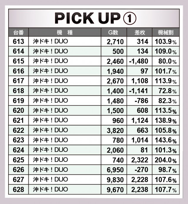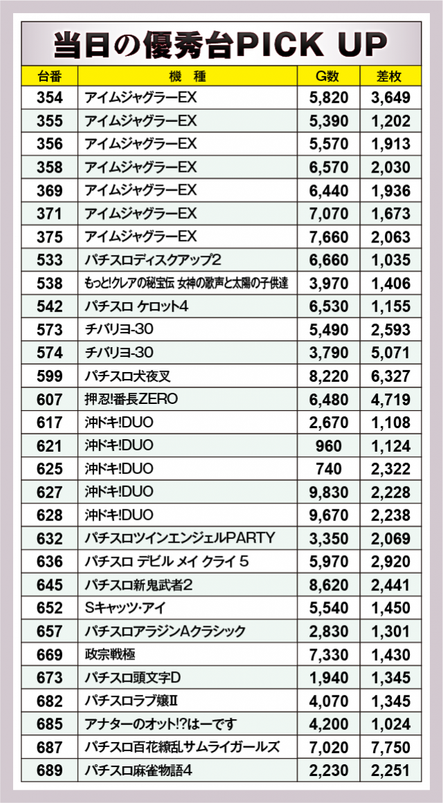 まずは優秀30台のPICK UPから。この日は30台中15台が差枚数+2千枚以上を達成!後述する好調スポット以外では、本日のトップ成績を叩きだした687番台『パチスロ百花繚乱サムライガールズ』が+7,750枚、次いで599番台『パチスロ犬夜叉』が+6,327枚、そして574番台『チバリヨ-30』が+5,071枚など、5千枚オーバーが目立っていた。その他にも様々な機種が名を連ねており、どの機種にもチャンスがあったという証だろう。
