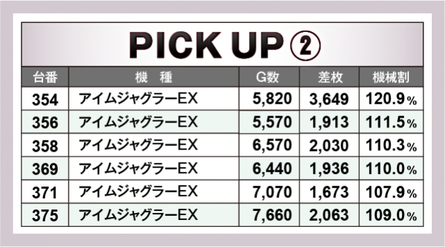続いて、この日は2か所の好調スポットが出現。まず『沖ドキ!DUO』では、マイナスに終わった台が数台あったものの、16台総差枚数+1万1千枚オーバーを獲得!次に『アイムジャグラーEX』では、354番台の+3,649枚を筆頭に好調6台総差枚数+1万3千枚オーバーとノーマルタイプらしからぬ好成績を収めた!