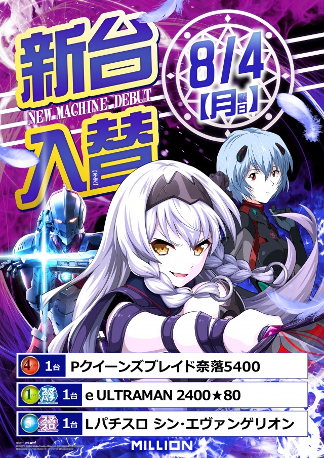 本日新台入替予定!ミリオン佐古店へご来店ください