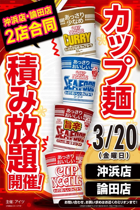 本日3月20日(金・祝)カップ麺積み放題開催‼(予定)