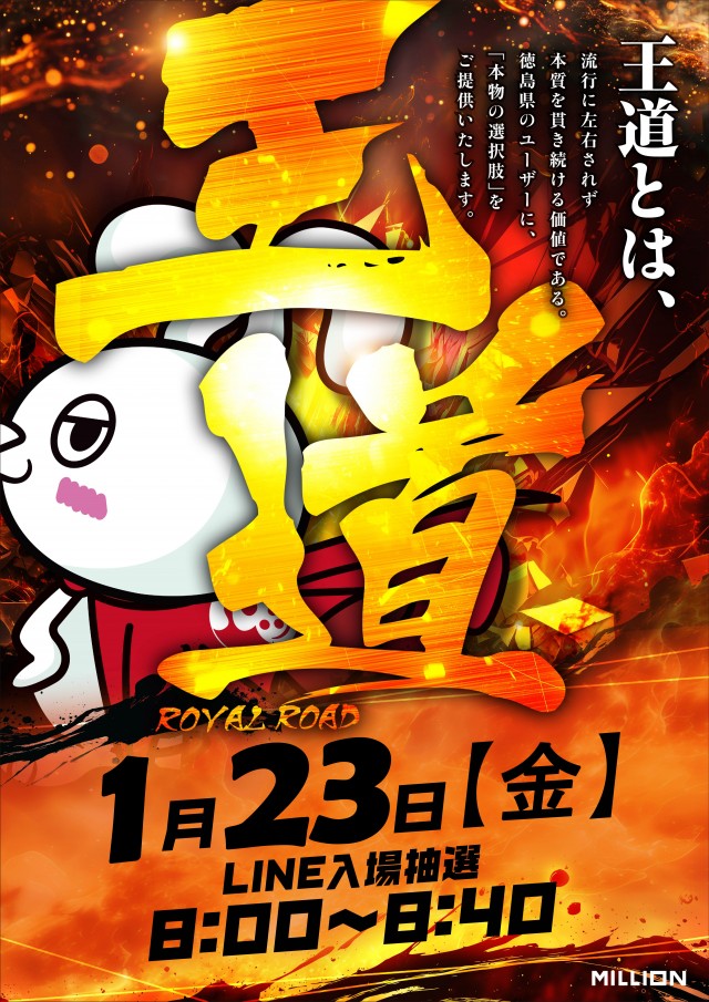 LINE入場抽選を採用しております。8:00~8:40に立体駐車場1Fにて受付致します。まずは、ミリオン中吉野店のLINEおともだち登録をして、LINEメニューから顔写真登録をお願いします。ご不明点はお気軽にスタッフまでお問い合わせください。 |