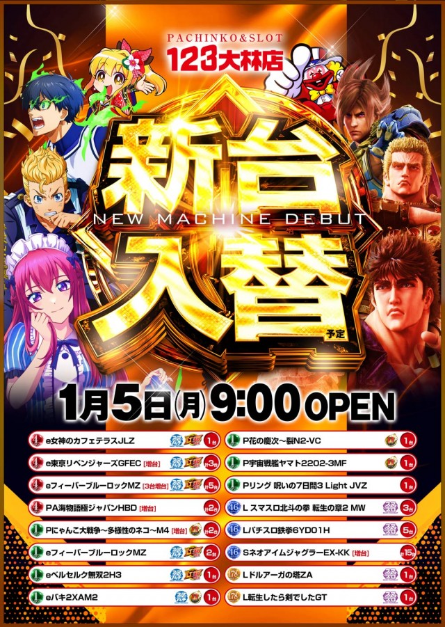 明日1月5日(月)新台入替予定!15機種26台導入!