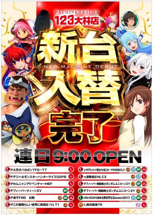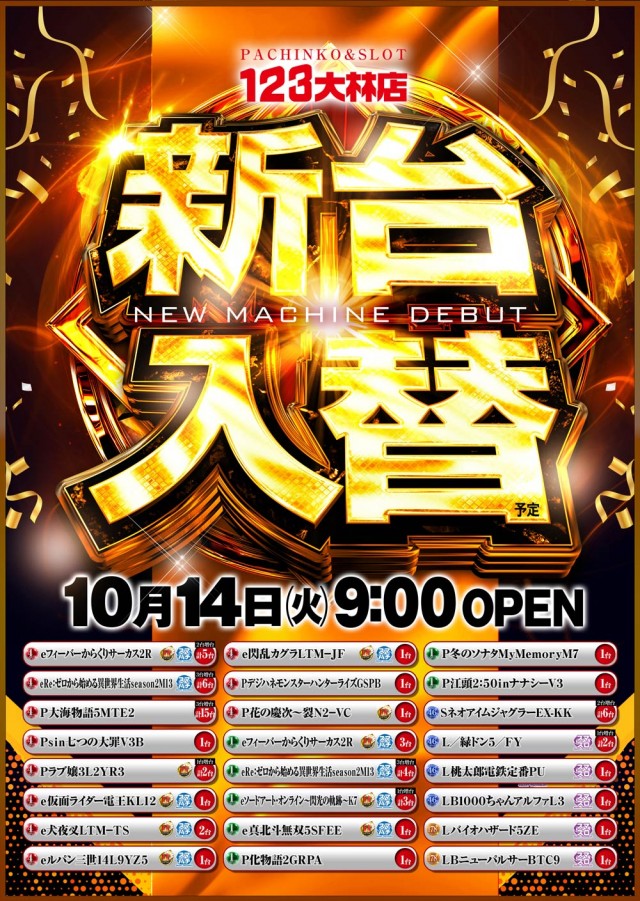 明日10月14日(火)新台入替予定!!11機種13台導入!